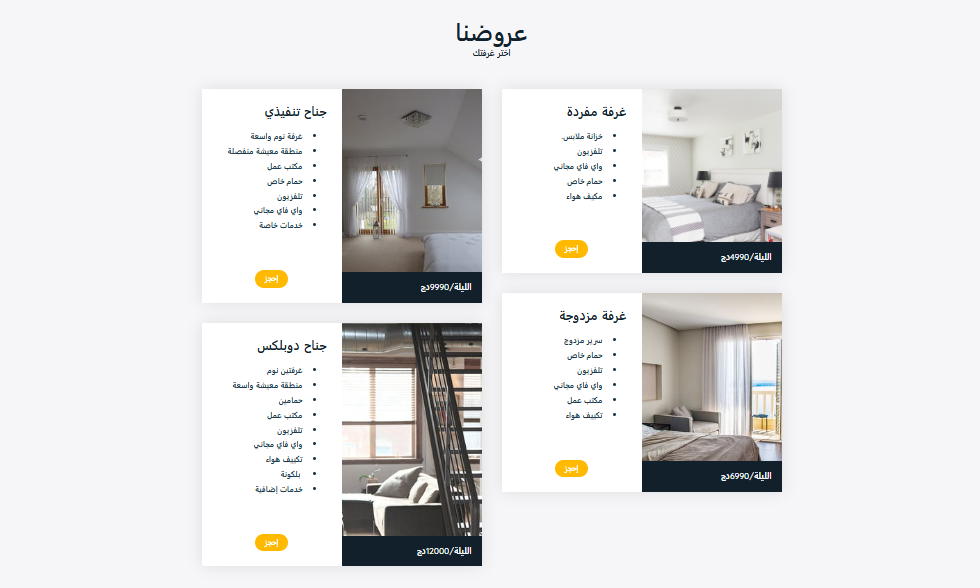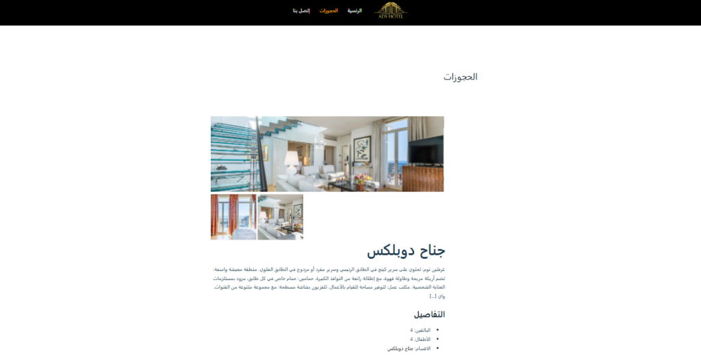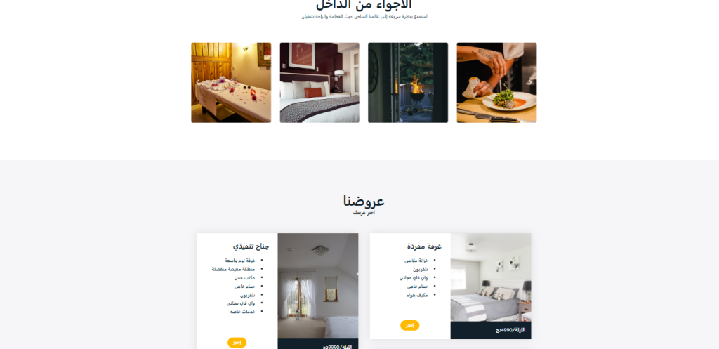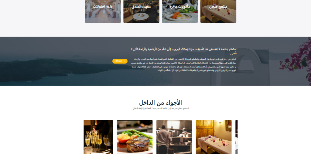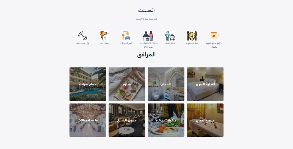 - واجهة عرض الخدمات والمرافق المتاحة: يعرض الموقع تفاصيل شاملة عن كافة المرافق مثل المطاعم، الصالات، المرافق الرياضية، والمسابح، مما يساعد العملاء على استكشاف التجربة الكاملة.